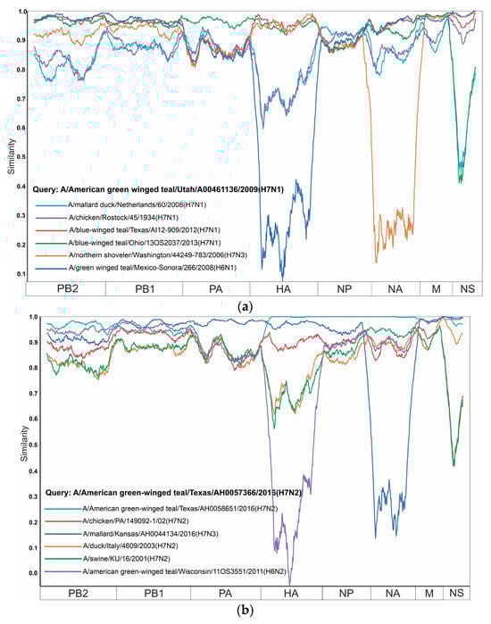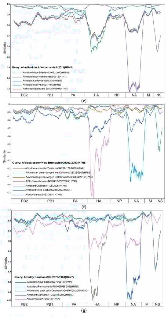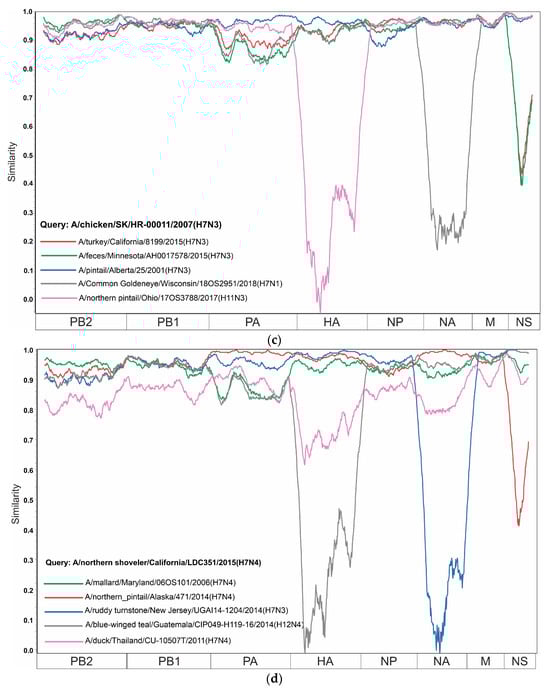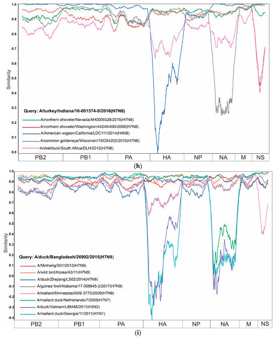 Similarly, in the plots in Figure 2d–i, similarities were found for most of the internal gene segments with the query strains and significant differences (30–40%) for the HA segment within one subtype (H7). In addition, all these plots are characterized by a decrease in identical nucleotides for the NS segment between the query strains and some other strains. The differences between the query strains and other samples in the HA segment may have a geographical explanation, while the difference in the NS segment is not related to the location of sample isolation. The high degree of identity between the internal gene segments of query strains and strains with other subtypes observed in all similarity plots in this study could be a consequence of reassortment between the subtypes.