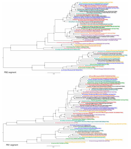 It should be noted that the phylogenetic relationship was also different for different sequences of viruses collected in one geographic region. For example, the NP segments of A/American-green-winged-teal/Texas/AH0058651/2016 (H7N2) and A/American-green-winged-teal/Texas/AH0057366/2016 (H7N2) are in the same subclade. They are phylogenetically closest to A/northern-pintail/Ohio/17OS3788/2017 (H11N3) and A/northern-shoveler/California/LDC351/2015 (H7N4). At the same time, these viruses formed different clades according to the phylogenetic tree based on PB1 segments. A/American-green-winged-teal/Texas/AH0058651/2016 (H7N2) was phylogenetically the most closely related to A/northern-pintail/Ohio/17OS3788/2017 (H11N3), while A/American-green-winged-teal/Texas/AH0057366/2016/2016 (H7N2) was the most closely related to A/northern-shoveler/Nevada/AH0009328/2015 (H7N8) and A/mallard/Pennsylvania/AH0038929/2015 (H7N7).