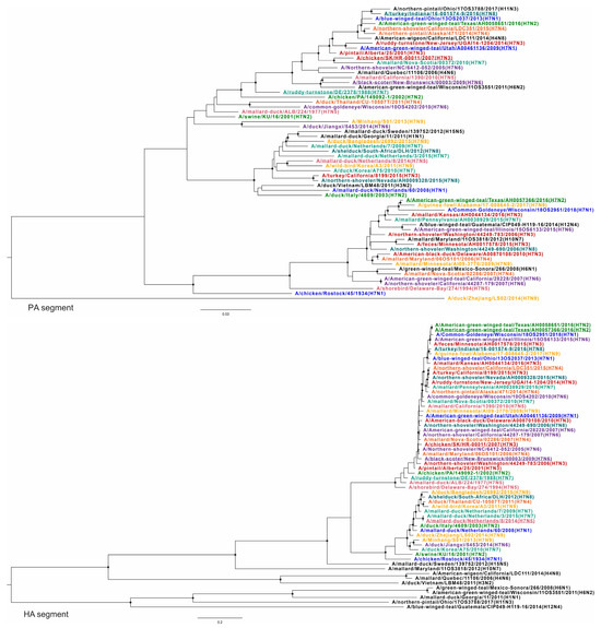 The phylogenetic tree for the NP segment retains the division into clades and subclades based on geographic features, except for virus A/American green winged teal/Utah/A00461136/2009 (H7N1) collected in the USA, which is phylogenetically closest to the NP segments of viruses collected in East Asia. In addition, according to the phylogenetic tree for the PA segment, the closely related A/turkey/California/8199/2015 (H7N3) and A/northern-shoveler/Nevada/AH0009328/2016 (H7N8) were grouped with viruses collected in Eurasia, but not with viruses collected in North America, as observed in the phylogenetic trees for other segments (PB2, PB1, HA, NP, M).