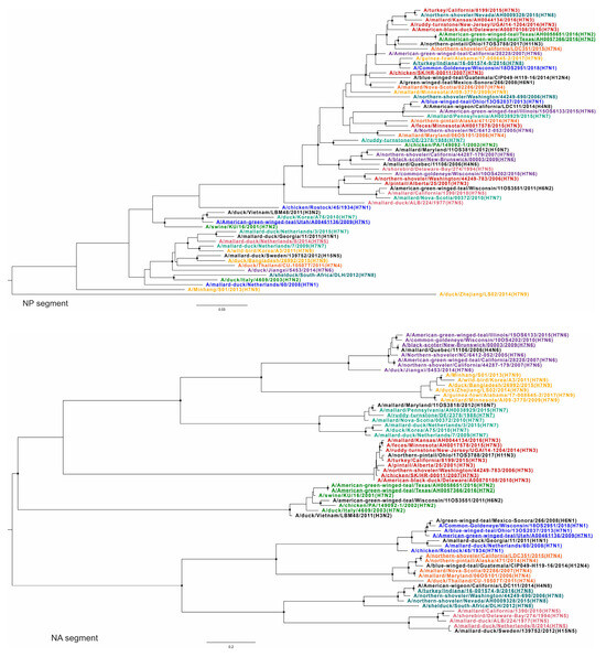 Phylogenetic trees for NP and NA segments. Each H7Nx subtype is color-coded; other subtypes are indicated in black. Black circles indicate nodes that were supported by ultrafast bootstrap approximation values above 95%.