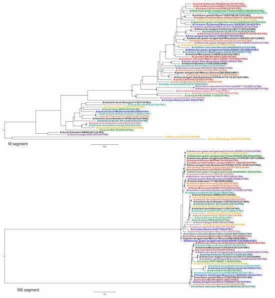 Phylogenetic trees for M and NS segments. Each H7Nx subtype is color-coded; other subtypes are indicated in black. Black circles indicate nodes that were supported by ultrafast bootstrap approximation values above 95%.