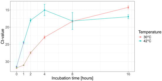 Optimization of the amplification conditions. To optimize the amplification conditions, Vaccinia virus DNA was incubated at either 30 °C or 42 °C for 1, 2, 4, 8, and 16 h, and, after quantification by qPCR, the Ct-value was plotted (y-axis). The 0 h represents the viral load used as input for each reaction.
