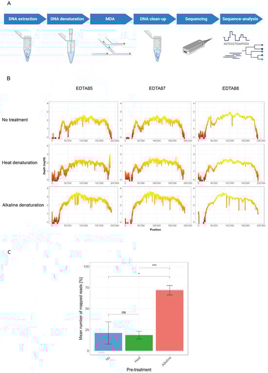 To improve Phi29-based MDA, we investigated the influence of a DNA pre-treatment step—either of heat denaturation or incubation in an alkaline lysis buffer—compared to untreated DNA. The heat denaturation consisted of incubating DNA in a 7.5 μL reaction containing 1× EquiPhi29 reaction buffer (Thermo Fisher Scientific, Waltham, MA, USA) and 3.5 μM of pooled SWGA primers for a denaturation step (3 min, 95 °C), followed by quenching on ice for 5 min. For the alkaline denaturation approach, we incubated the extracted DNA with an alkaline lysis buffer (pH 14, 0.4 M KOH, 10 mM EDTA, 100 mM DTT) in a sample-to-buffer ratio of 0.85 []. After 5 min of incubation at 4 °C, the mixture was neutralized by adding an equal volume of 1 M Tris-HCl (pH 4, Promega, Madison, WI, USA). Pre-treated samples were used thereafter for whole genome amplification based on the MDA.