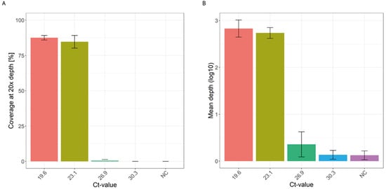 Sensitivity of the SWGA MDA combined with the alkaline denaturation. (A) Four 10-fold serial dilutions of ASFV (on the bottom is the corresponding Ct-value, NC = negative control) were amplified in independent replicates using the developed approach, resulting in similar 20× coverage up to a Ct-value of 23.1; (B) the corresponding mean sequencing depth of the four 10-fold serial dilutions shows a marked reduction after the second 10-fold serial dilution.