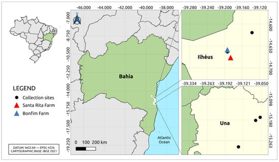 Collection sites (black dots) of the mosquito samples in Atlantic Forest fragments in Ilhéus and Una municipalities—Bahia state, Brazil. Collection sites of the positive samples (Santa Rita and Bonfim farms) are highlighted in red and blue. More details are provided in the Supplementary Materials (Table S1).