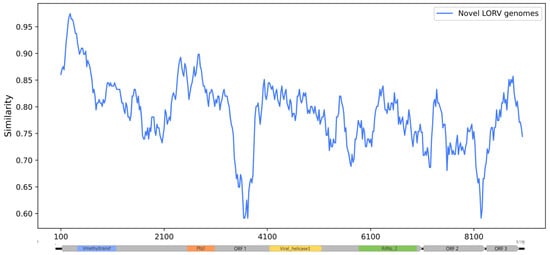 A sliding window similarity analysis was conducted using the Simplot++ v.1.3 with the input of a multiple sequence alignment containing the novel LORV genomes and the reference genome and applying the Jukes–Cantor model to estimate the similarity between them in a window size of 200 nt with intervals of 20 nt.