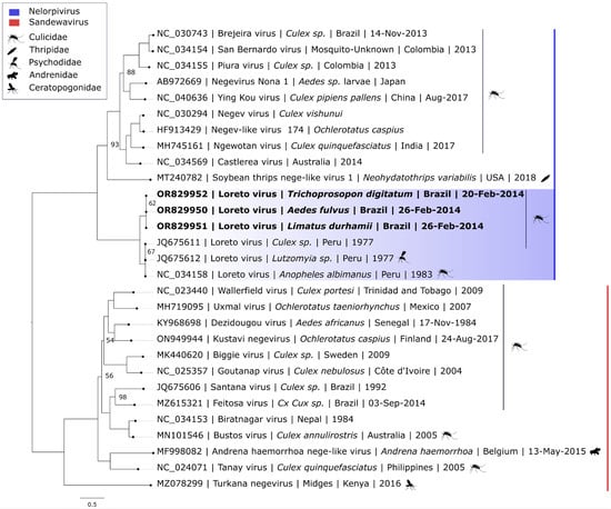 The Loreto virus (LORV) is classified into the proposed Negevirus taxon, composed of insect-specific viruses (ISVs) presenting a single-stranded positive-sense RNA genome of approximately 9 to 10 kb in length and spherical viral particles of 45 to 55 nm in diameter. Their diversity and host range are in constant expansion [1]. Negeviruses seem to be ubiquitous to several biomes, being isolated from various geographic locations in the Americas, Africa, the Middle East, Europe, Asia, and Australia [2].
