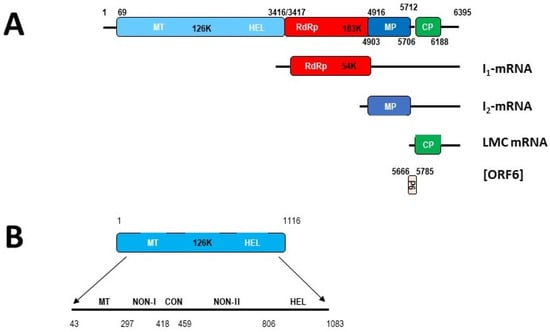 The 126 kDa protein contains an N-terminal-proximal, methyl transferase (MT) domain (involved in capping of the viral RNA) [26,27] and a C-terminal-proximal, helicase domain (involved in virus replication, oligomerization of the 126 kDa and 183 kDa proteins, and interaction with the tobacco (Nicotiana tabacum) N resistance gene product) [28,29,30,31,32], as well as three, short, interdomain regions (NON-I, CON, and NON-II; for Non-conserved-I, Conserved, and Non-conserved-II) [33] (Figure 1B). The NON-II and helicase domains, as well as part of the MT domain, individually function as RNA silencing suppressors [34]. The 183 kDa protein contains the viral RNA-dependent RNA polymerase (RdRp) component of the viral replicase, in its C-terminal 56 kDa extension of the 126 kDa protein [3,5,33,35,36,37] (Figure 1A).