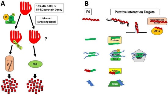 Models for possible roles of the 54 kDa protein (A) and the P6 proteins (B) during infection: (A) The 54 kDa protein is depicted as a right-handed structure, as described for various RdRps, with the thumb, palm, and fingers representing different substructural regions of the RdRp [85]. As described in the text, the 54 kDa protein may serve as a decoy to prevent the RdRp in the 183 kDa from being degraded, either (left side) by the TARF (TMV-associated RING Finger protein) complex and the 26S proteasome [the ubiquitin-mediated, proteasomal degradation system (UPS)], or (right side) by some other protease-mediated degradation systems (PDS), mediated by unknown targeting signals. TARF is an E3 ubiquitin ligase, acting in concert with ubiquitin-activating enzyme (E1) and ubiquitin-conjugating enzyme (E2), to polyubiquitinate proteins as signals for destruction. (B) The P6 proteins could act as countermeasures to inhibit specific host defense proteins (or interact with other factors, including DNA and RNA) that may have either regulatory or inhibitory roles in the infection cycle of tobamoviruses. The P6 proteins (left side) are shown as representing the various classes of antimicrobial peptides (AMPs), whose structures are classified as α-helices (α; in red); β-sheets [β; in light green, alone or in more complex arrangements including antiparallel β-sheets connected and flanked by random coils (blue)]; combined α-helices and β-sheets (αβ); or non-αβ (blue) [86]. Possible interacting targets include RNA, DNA, other defense factors, eukaryotic elongation factor 1A (eEF1a), proteases, other E3 ubiquitin ligase complexes, transcription factors, kinases, and specific RNases. In the absence of experimental data, the specific associations of particular structures with specific factors are for modeling purposes only.