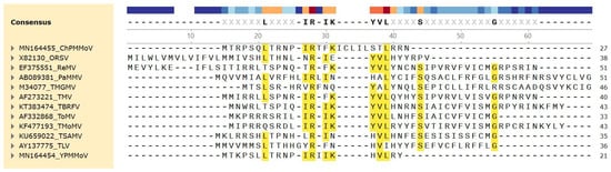 Amino acid sequences and alignment of P6 proteins encoded by Type A (canonical) ORFs 6, present in most Subgroup 1 tobamoviruses and two Subgroup 2 tobamoviruses (PaMMV and TSAMV) (see text). The abbreviations of the 12 tobamoviruses with Type A ORFs 6 are indicated on the left side, together with the GenBank numbers used for the sequence alignments. The conserved sequences are shown highlighted in yellow, and the consensus sequences are shown near the top in bold.