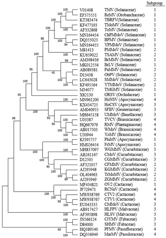 The evolutionary history of tobamoviruses, based on the full-length nucleotide sequence of 46 tobamovirus genomes, was inferred using the Neighbor-Joining method [130], is shown along with the GenBank number and Subgroup number designation of the tobamoviruses, as well as the plant family of first identification of the particular viruses indicated. The percentage of replicate trees in which the associated taxa clustered together in the bootstrap test (1000 replicates) are shown next to the branches.