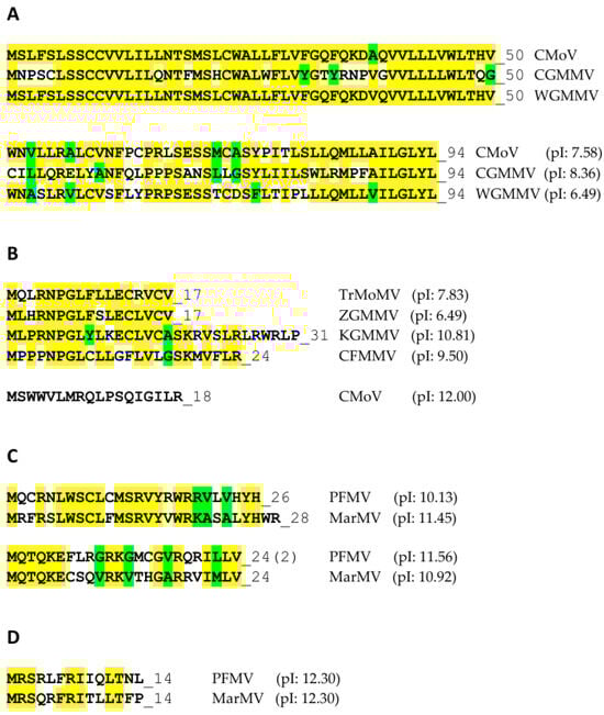Conservation of sequences between putative P6 proteins derived from specific non-canonical ORFs 6 of different viruses in the same Subgroup and original host family cluster: (A) The sequence comparisons of Type B, 94-amino acid proteins encoded by three Subgroup 3 Cucurbitaceae-infecting tobamoviruses (CMoV, CGMMV, and WGMMV). (B) The sequence comparisons of Type B, shorter P6 proteins from similar locations in their respective genomes encoded by four Subgroup 2 Cucurbitaceae-infecting tobamoviruses (TrMoMV, ZGMMV, KGMMV, and CFMMV), vs. a similar-sized P6 protein encoded by a different region of CMoV. (C) The sequence comparisons of two sets of Type B, shorter P6 proteins from similar locations in their respective genomes encoded by two Subgroup 4 Passifloraceae-infecting tobamoviruses (PFMV and MarMV). (D) The sequence comparisons of Type D, shorter P6 proteins from similar locations in their respective genomes encoded by PFMV and MarMV. The pIs of the peptide or protein sequences also are shown. Amino acid sequences identical between compared proteins are shown in yellow highlight; those in which the amino acid sequences are similar, are highlighted in light green. Dissimilar amino acids are not highlighted.