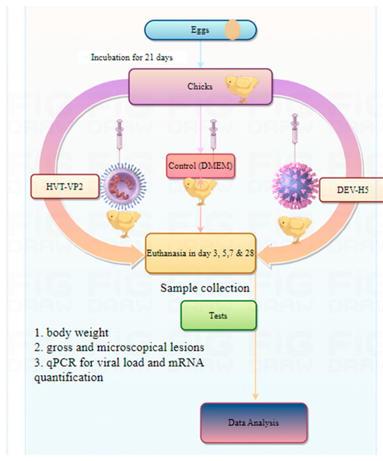 Ninety 1-day-old SPF chickens were randomly divided into three groups of thirty animals each. The groups were inoculated subcutaneously with 104 TCID50 of DEV-H5, 104 TCID50 of HVT-VP2, or DMEM (control group) in a 200 µL volume. To check for potential direct or indirect transmission, five additional animals were mixed with each of the vaccinated groups from day zero of the experiment. Animals were observed daily for clinical signs and mortality. At 3, 5, and 7 days post-infection (p.i.), three animals from each group were euthanized, and selected tissue samples and cloacal swabs were taken for the evaluation of viral loading and virus shedding and observation of gross/microscopic lesions. Environmental samples consisted of 0.5 g of bedding dissolved in 1 mL of PBS and collected from three evenly spaced locations. Gene expression of inflammatory cytokines and tight junction proteins at the intestine level was also assessed. At day 28 p.i., serum samples were taken for evaluation of antibody titers.