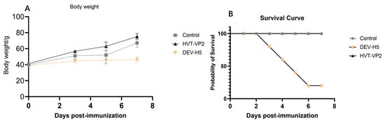(A) Changes in body weight over the experimental period illustrating the average weight of chickens in the control, DEV-H5, and HVT-VP2 groups. (B) Survival rate of chickens for control, DEV-H5, and HVT-VP2 groups showing the proportion of surviving individuals. Note that the control and HVT-VP2 group curves overlap during the observation period.