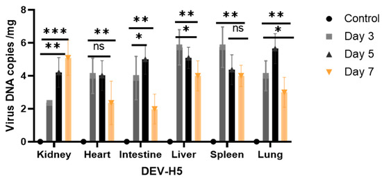 Quantification of viral DNA copy number in various tissue samples. The graph displays the mean viral DNA copy numbers (in copies per mg) detected in the kidney, heart, intestine, liver, and spleen samples. Statistical significance was determined using Graph Pad Prism version 9, with asterisks indicating significant differences between groups: * p < 0.05, ** p < 0.001 and, *** p < 0.0001), ns: not significant.