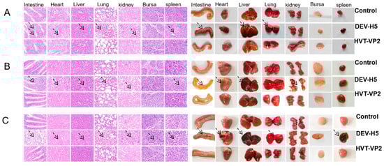 Gross and histopathological examination of tissue samples collected at 3 (A), 5 (B), and 7 (C) days p.i. with DEV-H5, HVT-VP2, and control groups. The control and HVT-VP2 groups exhibited no pathological changes throughout the study period. In contrast, the DEV-H5 group displayed significant pathological changes, as shown by arrows, at all assessed time points (days 3, 5, and 7), indicating the effects of the virus on the tissues.