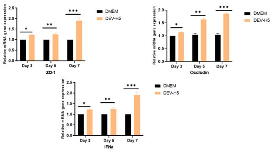 When we evaluated the associated gene expression of DEV-H5 infection in intestinal tissue, the expression of IFN-α was statistically upregulated. The analysis of tight junction-associated proteins showed that DEV-H5 replication increased ZO-1 and occludin expression at 3 and 5 days p.i., followed by a significant increase at day 7 p.i. (Figure 7).