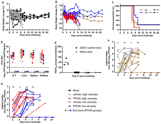 Intravaginal maEBOV challenge in progesterone-primed IFNAR−/− mice and PPCM efficacy at preventing infection. Four groups of mice (n = 10/group) received a topical gel intravaginally (vehicle or PPCM) and were then challenged with a 104 pfu dose and monitored for 21 days for weight loss (A,B), and mortality (C) as well as virus dissemination when moribund (D). Open symbols (D) are values obtained by RT-qPCR and substitute the value of undetected virus from titrating by plaque assay the other half of the corresponding tissue. Seroconversion was evaluated at day 21 post-challenge and PRNT50 was calculated when possible (E). Shedding of virus was assessed longitudinally using vaginal swabs starting on day 2 (F,G). Note that replicates in (F,G) are aligned for better tracking of individual values over time and some symbols may overlap in the early time points (n = 10 in all groups at days 2 and 4). Depending on the assay, the limit of detection was 102 PFU/gram (D, thick horizontal dotted line) or 101.82 PFU/mL (F,G) for titration by plaque assay, or 100.5 equivalent (equ) PFU/gram (D, thin horizontal dotted line) by RT-qPCR analysis with the virus stock used as standard. Subjects are represented by individual symbols in (A,B,D,E), and may overlap in (F,G). The Mantel–Cox test was applied to survival data. The t-test was applied to titration data from swabs. Asterisks (* or **) indicate statistical differences of p < 0.05 or 0.01, respectively, in the survival data (C) or average virus titers from swabs (F,G) between groups. (ns) for non-significant. Abbreviation: Genital tract (G.T.).