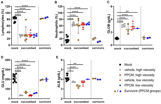 Hematology and biochemical profile of blood from IFNAR−/− mice following intravaginal maEBOV challenge. Bar graphs represent lymphocyte (A) and neutrophil (B) populations from whole blood analyses as well as levels of globulin (C), glucose (D), and albumin (E) in sera at a predetermined time or when the subject became moribund. Subjects are represented by individual symbols and error bars show standard deviations. Note that not all parameters could be determined from a sample due to low volume or hemolysis. A one-way ANOVA, followed by Tukey’s multiple comparisons test, was used. Asterisks (*, **, ****) indicate statistical differences of p < 0.05, 0.01, or 0.0001, respectively, for a given parameter between groups.