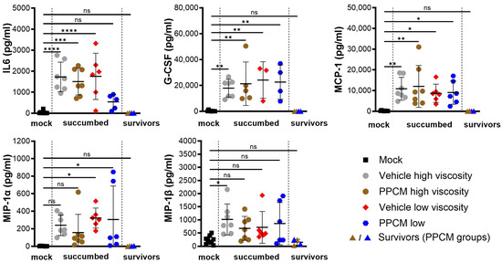 Consistent with Ebola virus disease (EVD) in mice, the majority of subjects that succumbed to disease or required euthanasia, regardless of the group, presented with lymphopenia (p < 0.0001), neutrophilia (p < 0.0001) (Figure 2A,B), as well as kidney and liver damage as determined by increased globulin (p < 0.01 to 0.0001) and low levels of glucose and albumin (p < 0.05 to 0.0001) in the blood (Figure 2C–E). Interestingly, corresponding data from EBOV survivors were comparable to those of mock samples collected throughout the study, which is in line with an absence of seroneutralization and virus in all survivor specimens. Increased secretion of virus-induced inflammatory molecules including IL-6, G-CSF, MCP-1, and MIP-1α/β was found in subjects that succumbed to disease compared to those from mock and survivor groups (non-significant to p < 0.0001) (Figure 3). This is consistent with an increase in granulocyte count and activation of other immune cells including macrophages, monocytes, and dendritic cells in the acute phase of infection. In addition, this provides further evidence of the potential prophylactic effect of PPCM against maEBOV, as values in mock and survivors were comparable.