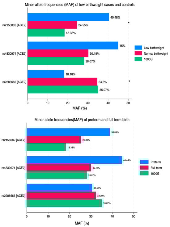 Figure 1 demonstrates the distribution of minor allele frequencies (MAFs) in the cases and in the controls and compares them with the MAFs in the general population (1000G). There is a statistically significant difference in rs2158082 (A > G) in women giving birth to low birthweight infants, which is p = 0.04. The rs2285666 (C > T) mutation is almost two times lower in the low birthweight cases than in the controls (p = 0.029); it is also lower than in the general population (1000G).