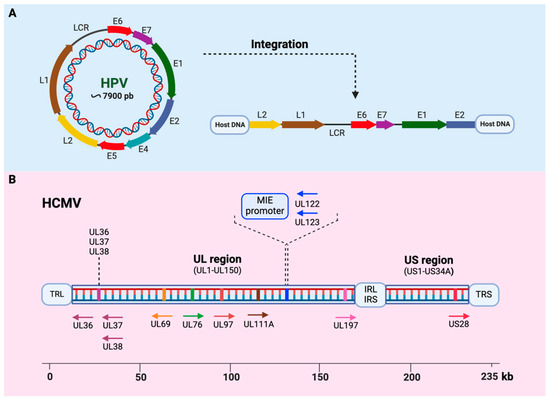 Schematic representation of human papillomavirus (HPV) and human cytomegalovirus (HCMV) genome organization. (A) The HPV contains a circular double-stranded DNA genome organized into three regions: the early (E) region, the late (L) region, and the long control region (LCR). The integration of HPV into the host genome induces a disruption or loss of the E2 suppressor gene sequences, which leads to the constitutive expression of E6 and E7 oncogenic proteins. (B) The HCMV contains a linear double-stranded DNA genome divided into the unique long (UL) and the unique short (US) regions. These regions are flanked by inverted terminals and internal open reading frame repeats. The relative position and orientation of some key HCMV gene products related to the oncogenic potential of this virus are also shown.