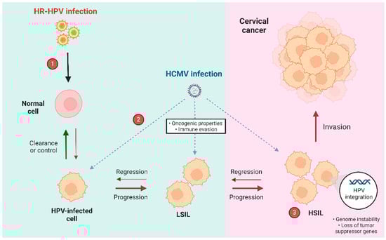 Based on the available evidence, we propose a model to illustrate the potential impact of co-infection with HR-HPV and HCMV in the development of cervical cancer. In this model, HR-HPV is hypothesized to initiate the transformation of normal cervical cells, which may either clear the infection or progress into a state of persistent HPV infection. When co-infection with HCMV occurs, the oncogenic processes initiated by HR-HPV are likely exacerbated. HCMV may contribute to these processes by promoting immune evasion, allowing the progression from low-grade LSIL to more severe HSIL. (Figure 2).