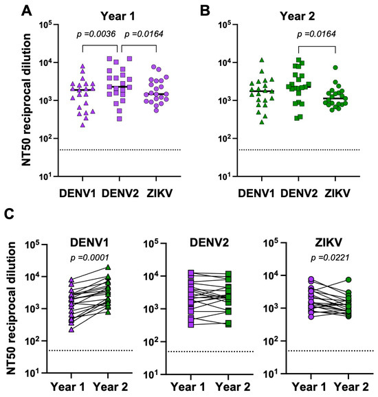 NT50 titers to DENV1, DENV2 and ZIKV. For all 21 participants, NT50 titers to the three viruses were measured at Year 1 (A) and Year 2 (B) post-ZIKV infection. ANOVA nonparametric Friedman multiple comparisons test was used. NT50 comparison between Year 1 and Year 2 timepoints for each virus was made using Wilcoxon matched pairs signed rank test (C). Year 1 titers are colored purple while Year 2 are colored green. DENV1 titers are indicated as triangles, DENV2 as squares and ZIKV as circles. Dotted lines indicate limit of detection of the assay. p-value is indicated. Black lines indicate medians.