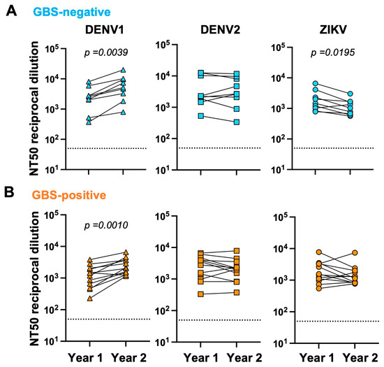 NT50 titers to DENV1, DENV2 and ZIKV. For all 21 participants, NT50 titers to the three viruses were measured at Year 1 and Year 2 post-ZIKV infection. Participants were separated into GBS-negative, light blue (A) and GBS-positive, orange (B) groups. DENV1 titers are triangles, DENV2 are squares and ZIKV are circles. Wilcoxon matched pairs-signed rank test was used for comparison. Dotted lines indicate limit of detection of the assay. p-value is indicated. Black lines indicate medians.