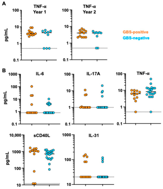 3.4. Cytokine Levels in GBS-Positive and -Negative Groups