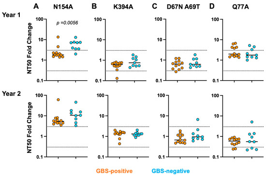 GBS-negative participants are more sensitive to a glycan removal than GBS-positive participants. NT50 fold change in N154A (A), K394A (B), D67N A69T (C) and Q77A (D) were calculated by plotting the ratio between NT50 of mutated RVP and NT50 of wild-type ZIKV H/PF RVP in both Year 1 and Year 2 timepoints. Dotted lines indicate 0.3- and 3-fold difference which marks the normal range of variation in the assay. The nonparametric Mann-Whitney test was used to compare GBS-positive group (orange) to GBS-negative group (blue). p-value is indicated. Black lines indicate medians.