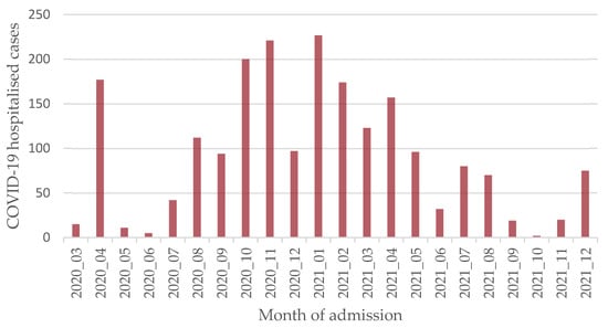 Additionally, the temporal distribution in terms of the month of admission for our COVID-19 hospitalised cases resulting from the recruitment implementation described in Section 2.2 is shown in Figure 1.