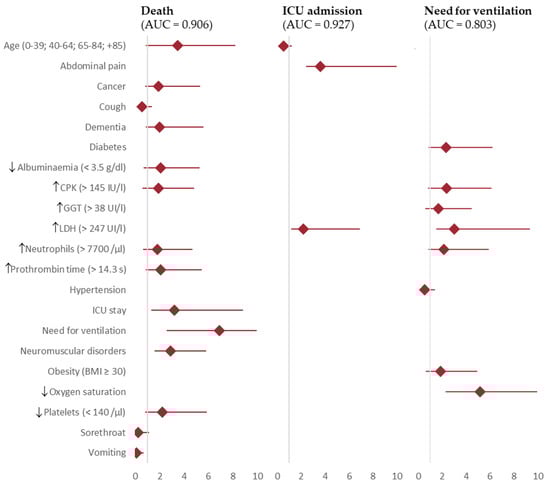 In this sense, the lower predictive ability for the need for ventilation model may be attributed to the absence of a detailed characterisation of the ventilation type required, ranging from patients who used nasal goggles to those with invasive mechanical ventilation. However, including only those patients with mechanical ventilation would not have substantially improved our results either, as the sample size would be smaller and thus also the power and reliability of our findings. Likewise, our models have low sensitivity and are therefore biased in correctly identifying people who will ultimately have a dismal outcome. With this in mind, it should be noted that the consideration of other previously reported strongly associated factors beyond those investigated in this paper, such as the assessment of chest X-ray infiltrates [], could help to increase the sensitivity and predictive ability of these models.