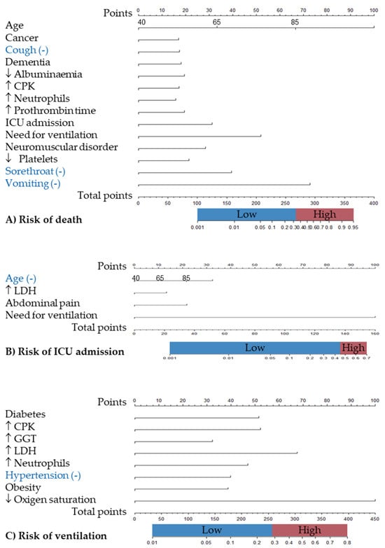 Finally, nomograms (Figure 3) were constructed for each outcome based on the aforementioned results. A score of 67 or higher was considered indicative of a high risk of mortality, with a predictive value of 0.338, corresponding to approximately 70 points. A high risk of ICU admission was set for a score of more than 85 points, corresponding to a model predictive value of more than 0.455. Similarly, a high risk of ventilation was set for a score of more than 58 points, corresponding to a model predictive value of 0.293.
