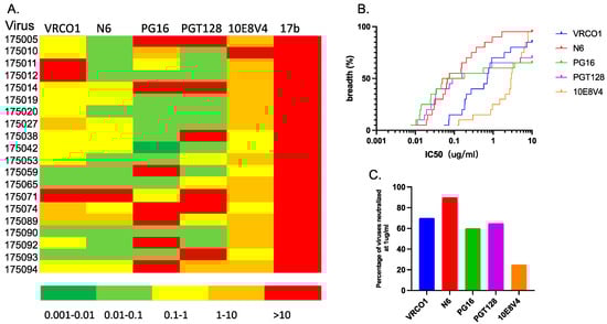Antibody-based vaccine development is exceptionally challenging because of the increasing genetic diversity of HIV-1 viruses [,,]. This genetic diversity is also challenging for interventions aimed at using broadly neutralizing antibodies for HIV-1 prevention; measuring bNAb efficacy against different circulating viral subtypes and recombinants is crucial for this approach []. In order to characterize the phenotypes of the IMCs fully, we evaluated their sensitivity to bNAbs that target the major neutralization epitopes of the HIV envelope protein [V1V2-glycan apex (PG16), V3-glycan (PGT128), CD4 binding site (VRC01 and N6) and gp41 MPER (10E8V4)]. A non-neutralizing antibody, 17b, which binds a CD4-induced (CD4i) epitope on gp120 [], was used as a non-specific antibody control. The 50% inhibitory concentrations (IC50s) used to measure bNAb sensitivities of all 20 IMC-derived viruses are shown in a heat map (Figure 2A). Previous studies reported that bNAbs targeting the CD4 binding site, especially antibody N6, achieved the most potency and highest breadth [,]. In this study, the CD4 binding site bNAb N6 also showed the most potency (median value = 0.07 μg/mL) and the greatest breadth against this panel of 20 IMC-derived viruses (95%) (Figure 2B,C).