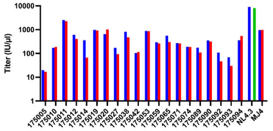 - Deymier, M.J.; Claiborne, D.T.; Ende, Z.; Ratner, H.K.; Kilembe, W.; Allen, S.; Hunter, E. Particle infectivity of HIV-1 full-length genome infectious molecular clones in a subtype C heterosexual transmission pair following high fidelity amplification and unbiased cloning. Virology 2014, 468–470, 454–461. [Google Scholar] [CrossRef]