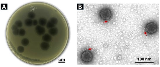 A total of seven bacteriophages were isolated from wastewater, and the one producing the largest, clearest, and most well-defined lysis plaques was selected for further study. This bacteriophage was designated as Phylax-28 (from the Greek “guard” or “protector), which is capable of producing clear and well-defined lysis plaques, with a diameter of approximately 1.2 cm (Figure 1A). The plaque size generated by Phylax-28 is notably larger than typical Salmonella phages, which are generally reported to form plaques ranging between 0.5 and 3.5 mm in diameter [54,55,56,57].