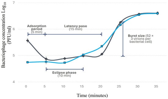 To evaluate the replication kinetics of the bacteriophage, a single colony of the host strain was resuspended in 50 mL of TSB medium and incubated at 37 °C with shaking at 100 rpm. When the optical density at 600 nm reached 0.1, the phage was added at a multiplicity of infection (MOI) of 0.1. At five-minute intervals, two aliquots were collected from the culture, one treated with chloroform, which lyses the host cells to release intracellular phage particles, and one left untreated. The aliquots were centrifuged at 10,000× g for 1 min, and the supernatant was used to determine the bacteriophage concentration through serial decimal dilutions and the double-agar-layer method, as described by [37]. This procedure was performed in triplicate for each time point to ensure the reproducibility and accuracy of the results. The adsorption phase was monitored by determining the rate of bacteriophage attachment to host cells over time, while the eclipse phase was identified as the period between initial infection and the detection of intracellular phage particles. The latency phase was defined as the interval between infection and the release of newly formed phages into the medium. All phases were assessed in triplicate to ensure the reproducibility and accuracy of the results.