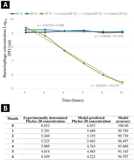 Kinetics of Phylax-28 bacteriophage concentration reduction at various temperatures. (A) No significant reduction was observed at 60 °C (black line) and 65 °C (blue line). However, at 70 °C (green line), the reduction follows first-order kinetics with an r2 value of 0.991. (B) Experimental results on the stability of Phylax-28 at 28 °C, measured monthly over six months, were compared with the model’s predicted stability. The phage concentration is expressed as the log10 of PFU/mL. The model’s accuracy was expressed as a percentage.