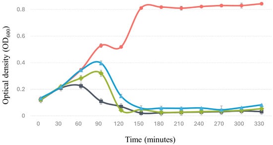The lytic activity of bacteriophage Phylax-28 against Salmonella in trypticase soy broth (TSB). The red line indicates the normal growth of Salmonella without bacteriophage treatment, serving as the control. The black, green, and blue lines represent treatments with Phylax-28 at multiplicities of infection (MOI) of 0.1, 0.01, and 0.001, respectively. A significant reduction in bacterial growth is observed across all MOI levels, with Phylax-28 showing pronounced efficacy in reducing Salmonella concentrations, even at the lowest MOI.