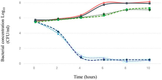 Effect of bacteriophage and ciprofloxacin on the concentration of Salmonella and probiotic bacteria in a simulated intestinal environment. The graph displays Salmonella growth (red line) in the absence of ciprofloxacin, Salmonella in the presence of ciprofloxacin (black line), probiotic bacteria without ciprofloxacin (dashed green line), probiotic bacteria with ciprofloxacin (dashed dark blue line), Salmonella in the presence of bacteriophage (dotted light blue line), and probiotic bacteria with bacteriophage (dotted dark green line). The probiotic bacteria used includes five strains: Bacillus clausii, Bacillus coagulans, Lactobacillus paracasei, Lactobacillus rhamnosus, and Limosilactobacillus reuteri, mixed in equal proportions. The magnitude of error bars, represented as standard deviation, are not discernible on the graph.