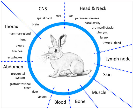 Depiction of VX2 tumor rabbit models grouped according to body regions and organs.