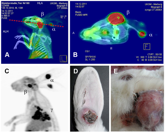 Metastatic spread of VX2 tumors in rabbits. (A,B) PET-CT analyses showing a rabbit monoauricular VX2 tumor (α) and a lymphatic metastasis in the regional sentinel lymph node (β). (C) PET analysis of a rabbit with biauricular VX2 tumors (α) that has developed regional lymph node (β) and distant lung (γ) metastases. Macroscopic views on (D) primary auricular VX2 tumor and (E) lymph node metastases. Figure adapted from Rossmann et al. 2014 [81].