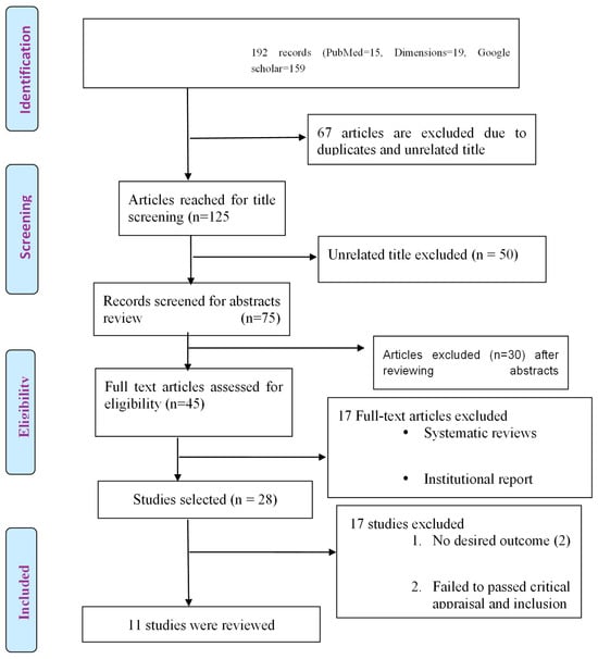 After retrieving the articles, we screened titles and abstracts to remove duplicates and irrelevant studies. We conducted a search for relevant studies using predefined keywords in selected databases, applied a screening process, and removed duplicate records among the articles retrieved from multiple sources [14,15]. A full-text review of the remaining articles was conducted to assess alignment with the objectives of the review. Figure 1 below describes the flow of the literature selection process. The papers were further screened and evaluated based on their titles and abstracts. Any duplicate articles found to be the same in multiple databases were removed. The search results were generated based on terms in the specified databases, including Google Scholar (n = 159), PubMed (n = 15), and Dimensions (n = 19). The reviewers systematically identified potential biases and resolved discrepancies through consensus to ensure an unbiased evaluation and study selection. A total of 125 studies were initially identified. After a thorough review process, 28 studies were shortlisted. Of these, only 11 studies met the strict inclusion criteria of utilizing IgG antibody and/or RNA PCR testing for HDV, and these were included in the final analysis (Figure 1). Per the PRISMA 2020 recommendation, the list of all 28 included and excluded studies and reasons for their inclusion or exclusion are provided in the Supplementary Data (Table S1).