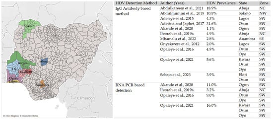 - Ifeorah, I.M.; Gerber, A.; Dziri, S.; Bakarey, S.A.; Le Gal, F.; Aglavdawa, G.; Alloui, C.; Kalu, S.O.; Ghapouen, P.A.B.; Brichler, S.; et al. The prevalence and molecular epidemiology of hepatitis delta virus in Nigeria: The results of a nationwide study. Viruses 2024, 16, 1236. [Google Scholar] [CrossRef]