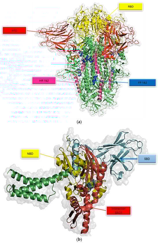 The S1 subunit plays a pivotal role in viral entry and pathogenesis. It identifies and binds to host cell receptors, known as viral attachment. Subsequently, the S2 subunits facilitate the fusion of the viral-enveloped membrane and the host cell membrane, also known as membrane fusion [7,9]. Angiotensin-converting enzyme 2 (ACE2) is a well-known and well-documented host cell receptor for cellular entrance. Regardless, the virus may enter the cell via either the clathrin-independent non-endosomal pathways or clathrin-mediated endosomal pathways [10,11,12]. According to the reviewed literature, little is known about the pathogenesis of hCoVs, and what is known suggests that the level of expression of chaperones may potentially impact coronaviruses’ viral load [13]. These pro-infection and antiviral activities present opportunities for developing antiviral treatments and therapies via exploiting their immune activities or inhibiting the molecular chaperones with pro-infection activities [14].