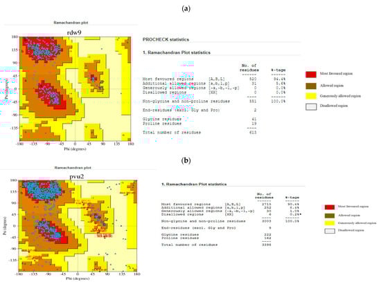 (a) Ramachandran plots of the modelled human HSPA8 obtained from PDBsum [28,42]. (b) Ramachandran plots of the modelled SARS-CoV-2 spike protein obtained from PDBsum. The asterisk (*) indicates residues in disallowed regions [28,42].