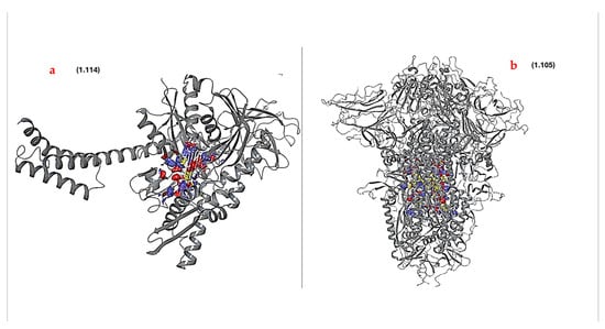 SWISS-MODEL (https://swissmodel.expasy.org/, accessed on 21 November 2023) [27] was used for the homology modelling of the 3D structures of the human HSPA8 and SARS-CoV-2 spike protein, and the models were selected among the other models based on QMEANDisCo Global score and GMQE (Global Model Quality Estimate) values. GMQE and QMEANDisCo Global give an overall model quality measurement between 0 and 1, with higher numbers indicating higher expected quality [27]. The GMQE of the selected SARS-CoV-2 spike protein model was 0.71, and the QMEANDisCo Global value was 0.73 (Figure 1a) [27]. The GMQE of the selected HSPA8 model was 0.89, and the QMEANDisCo Global value was 0.80. Therefore, both values indicated a high structure quality (Figure 1b).