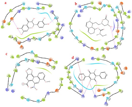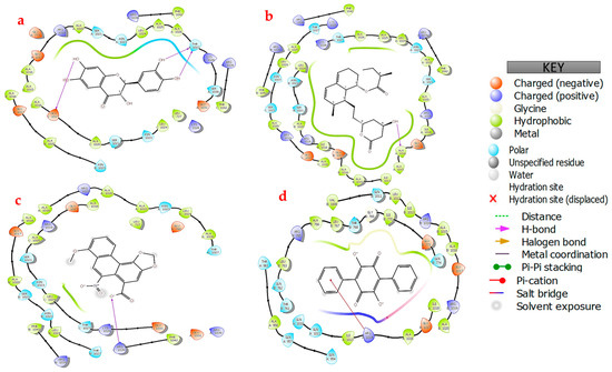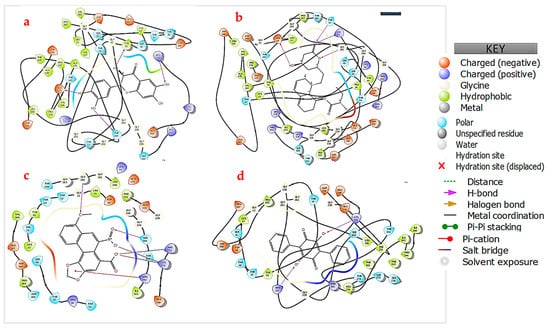 The prepared small molecules were similarly subjected to flexible docking using the XP docking programme [35]. The docking scores and Glide Gscores from the docking simulations are summarized in Table 4 for the complex with the four small molecules. Figure 9 shows the 2D diagrams generated to better assess the protein complex–ligand interactions.
