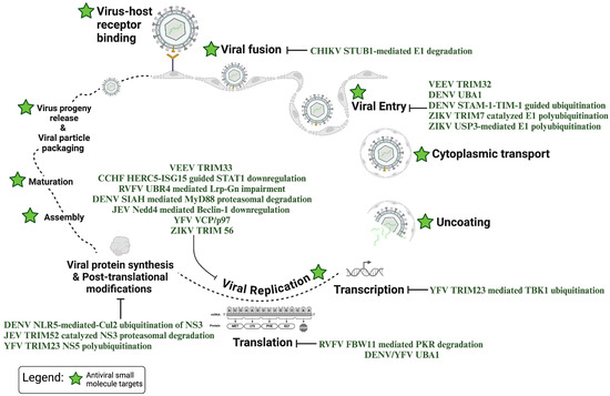 | PYR-41 | Inhibits ubiquitin- activating enzyme E1 (UBA1) | Restricts viral translation | Antiviral | DENV | [131] |